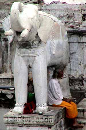 Un sadhu, à l'abri d'une statue, à l'entrée d'un