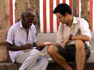 train de se faire lire les lignes de la main par un pseudo diseur de bonne