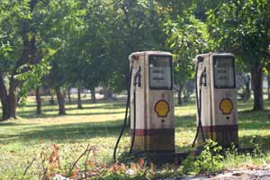 Des pompes à essence à l'abandon dans un parc de Luang Prabang.