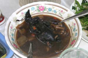 Le même poulet un peu plus tard, carbonisé, avec la tête