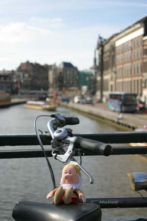 Roland, toujours en forme, qui fait du vélo sur un pont d'Amsterdam...